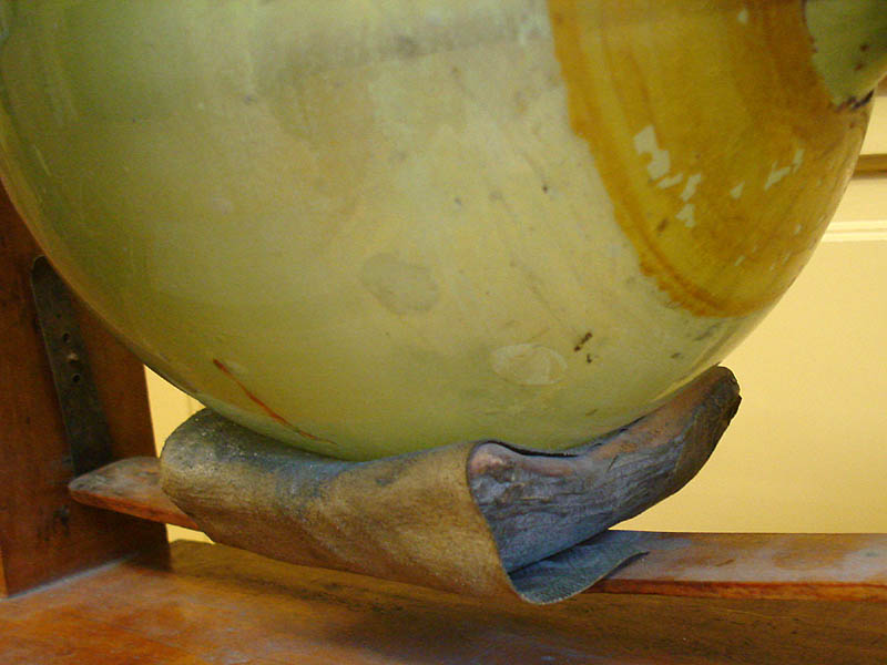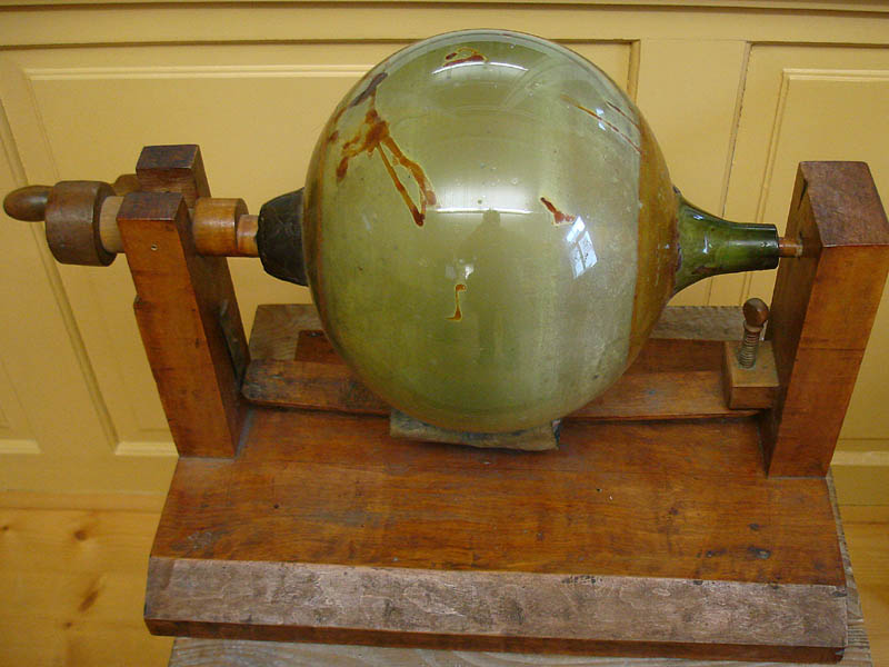 Es besteht aus einer hohlen Glaskugel, die in einem Drehgestell gelagert ist. Darunter ein Stück Textil, das mit variablem Druck angedrückt werden kann. Es geht also ziemlich sicher um Reibungselektrizität ... eine "Elektrisiermaschine". Aber ... ist es ein Forschungsinstrument, Spielzeug, Demonstrationsinstrument in der Schule - oder hat es eine andere praktische Anwendung? Fehlt hier ein Teil - oder wurde ein Entladungsstab von Hand gehalten?